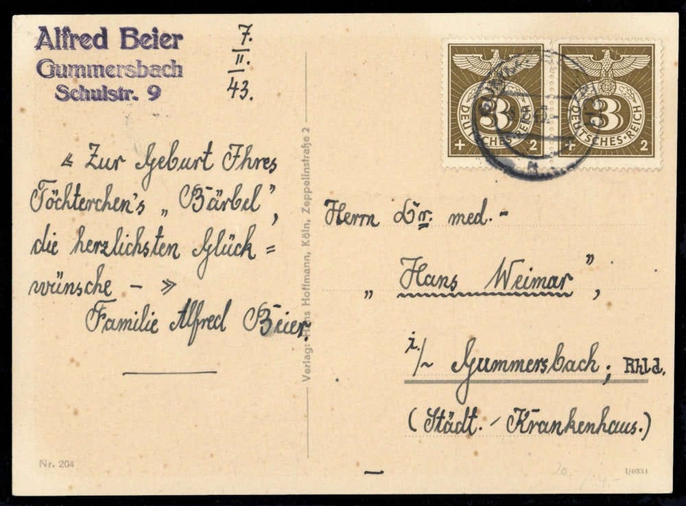 Los Nr. 39081943, 3+2 Pfg. Sonderstempelmarke, Paar (1 Wert Eckfehler) zusammen auf farbiger Postkarte (Storchenmotiv) von GUMMERSBACH 8.2.1943, adressiert nach Gummersbach, leichte Alterungsspuren.