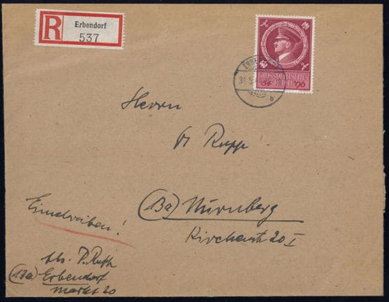 1944, 54+96 Pfg. Adolf Hitler als EF auf R-Brief von ERBENDORF 31.5.1944, adressiert nach Nürnberg, rs. Ankunftsstempel, Kuvert oben und rechts geöffnet, etwas größeres Format.