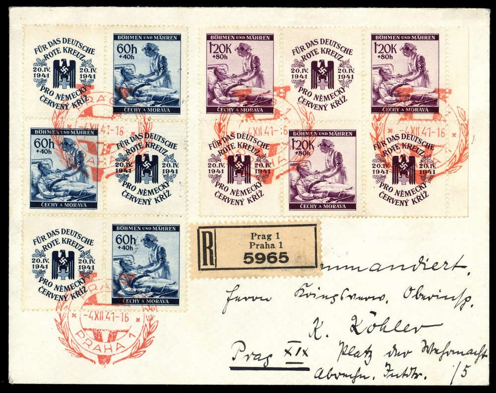 1941, Rotes Kreuz, drei Sätze zusammenhängend mit Zierfeld auf Orts-R-Brief mit rotem Viktoria-SST "Prag 4.XII.41", Aufklebespuren