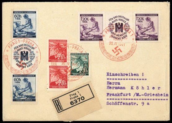 1941, 60 H. + 1.20 K. Rotes Kreuz, je Zusammendruck (SZd10 + WZd14) mit Nr. 22 (2x) + 23 zusammen auf R-Brief mit dreimal rotem SST "PRAG 20.IX.41 - GEBURTSTAG DES FÜHRERS" nach Frankfurt am Main, rs. Ankunftsstpl., leichte Spuren.