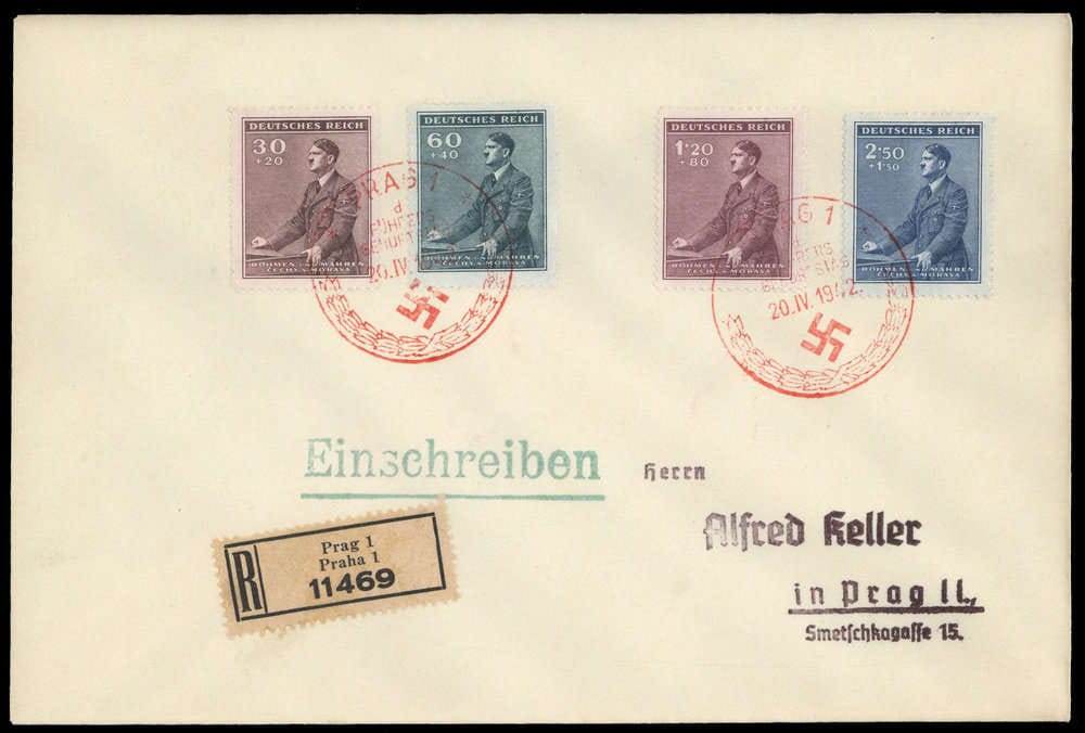 1942, 53. Geburtstag von Adolf Hitler, 4 Werte komplett auf R-FDC mit zweimal rotem ESST "PRAG 1 - 20.IV.1942" nach Prag, leichte Spuren.