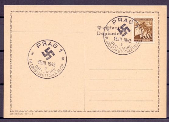 "PRAG 1 15.III.42 DREI JAHRE IM GROSSDEUTSCHEN FREICH", 2 x auf Blankokarte mit 30 H. Lindenzweig
