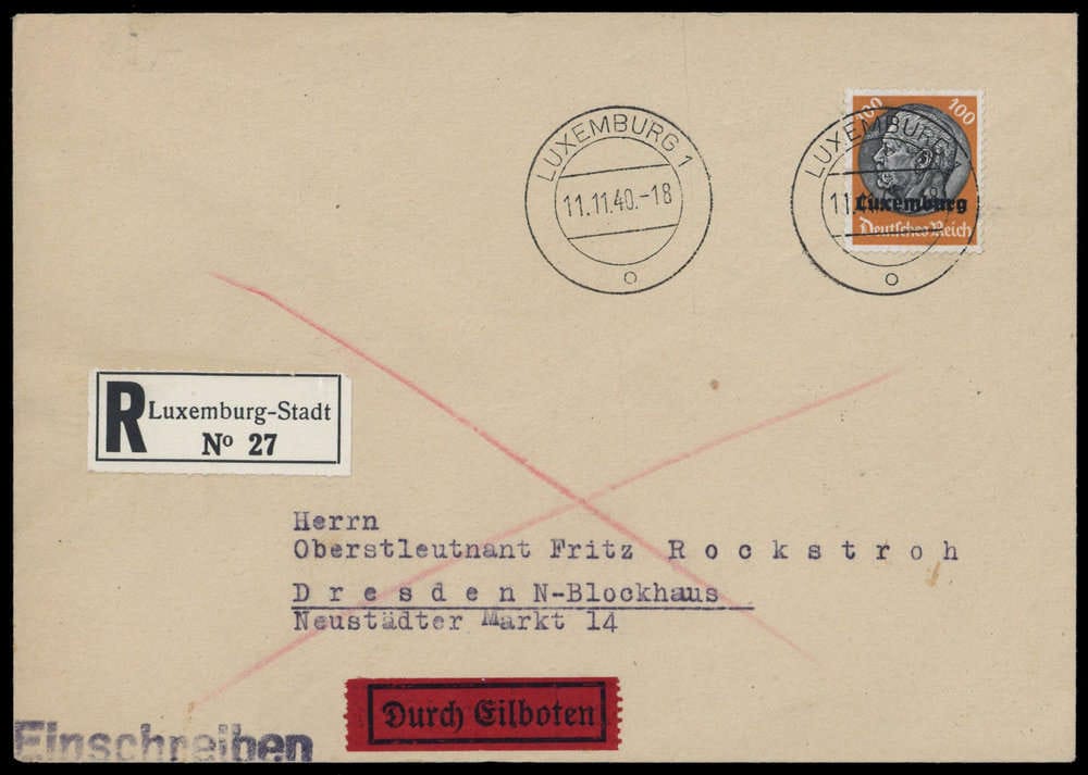1940, 100 Pfg. Hindenburg auf R-Eilboten-Brief (R-Zettel: Luxemburg-Stadt) von LUXEMBURG 11.11.1940 nach Dresden, rs. Ankunftsstpl., leichte Spuren.