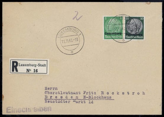 1940, 5+50 Pfg. Hindenburg auf R-Brief (R-Zettel: Luxemburg-Stadt) von LUXEMBURG 11.11.1940 nach Dresden, rs. Ankunftsstpl., leichte Randspuren.