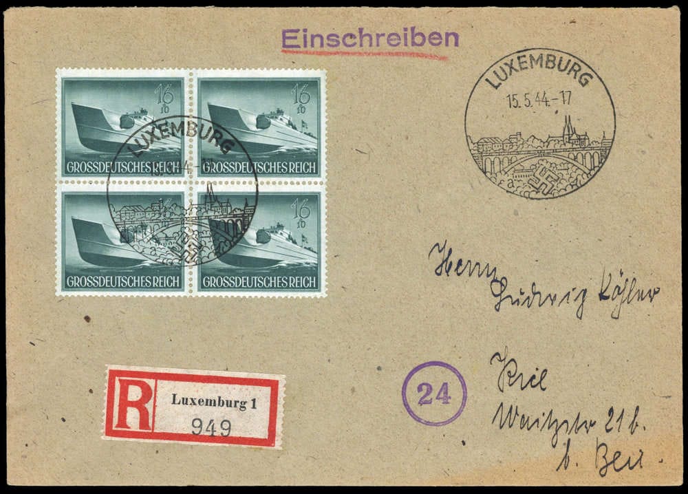 "LUXEMBURG 15.5.44", klarer SST auf DR 16+10 Pf Schnellboot im Viererblock, R-Brief Altersspuren, Ak-K2 "KIEL 17.5.44"
