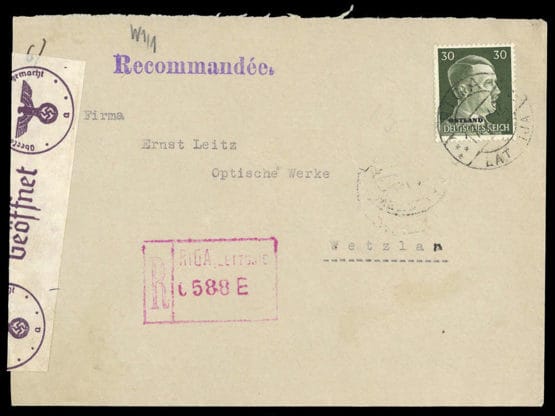 1941, 30 Pfg. Hitler und rs. Nr. 8 zusammen auf ZENSUR-R-Brief (Zensurstreifen und Stempel), roter R-Stempel von RIGA 17.2.1942, adressiert nach Wetlar, rs. Ankunftsstempel, leichte Stempel- und Alterungsspuren.