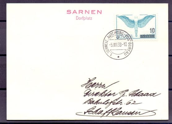"SARNEN DORPFLATZ", roter L2 auf phil. Karte mit 10 C. Flugpost und "1. SAPB 5.VIII.38" nach Schaffhausen