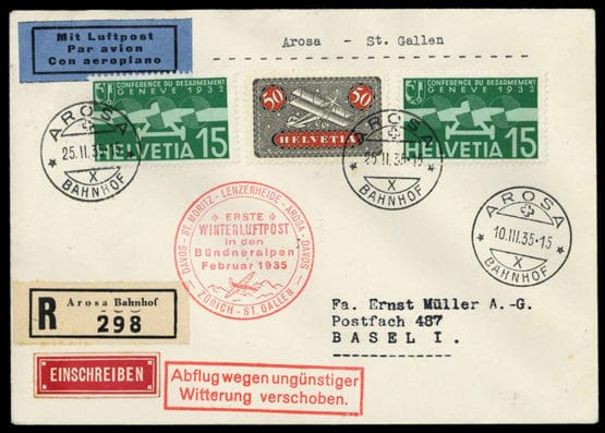 1935, R-Winterluftpostbrief Arosa-St. Gallen 10.III.35 mit rotem BSt. und 2 x 15 C. Abrüstungskonferenz und 50 C. Flugpost, Ausfallstempel