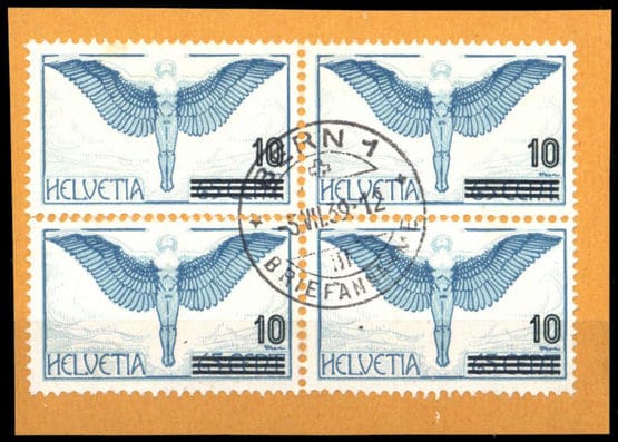 1938, 10 a. 65 C. Ikarus vier Werte gestempelt auf Briefstück von Bern 5.7.39 mit einmal dem Zumstein Plattenfehler 22.2.02 "Querstrich des A mit Ansatz"
