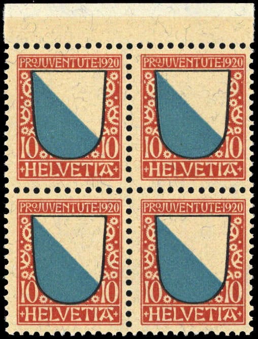 1920, 10 C. Pro Juventute Einzelwert als Oberrand 4-er Block postfrisch (ME 80.-)