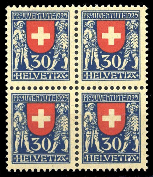 1925, 30 + 10 C. Pro Juventute als postfrischer Viererblock mit einmal dem Plattenfehler "Buchstaben H und E von HELVETIA unten zusammenhängend" (ME 30.-)