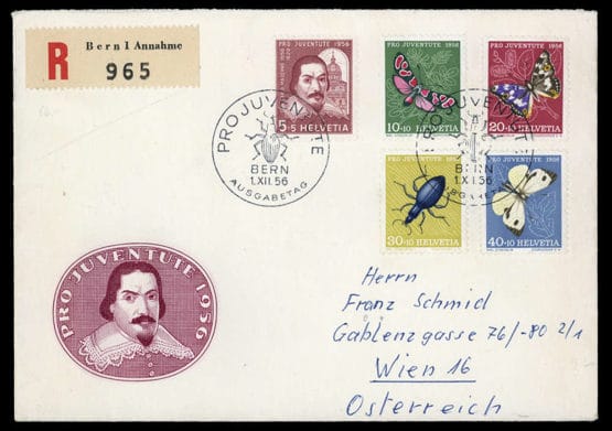1956, Pro Juventute auf R-Schmuckumschlag-FDC mit ESST Bern nach Österreich (ME 50,-)