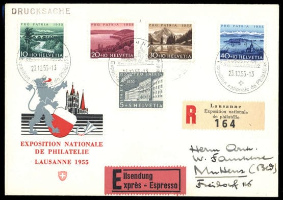 1955, Pro Patria, 5 Werte komplett auf Schmuckkuvert (Briefmarkenausstellung LAUSANNE 1955) als R-Brief mit passendem Sonder-R-Zettel und SST "LAUSANNE 23.10.1955", adressiert nach Mutten, rs. Ankunftsstempel. Leichte Stempelspuren.