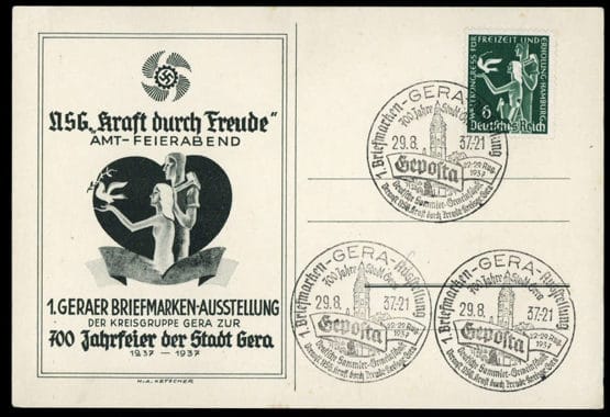 1937, 6 Pfg. Weltkongress bs. auf Sonderkarte "Kraft durch Freude" mit drei SST "Gera 29.8.37 Geposta"