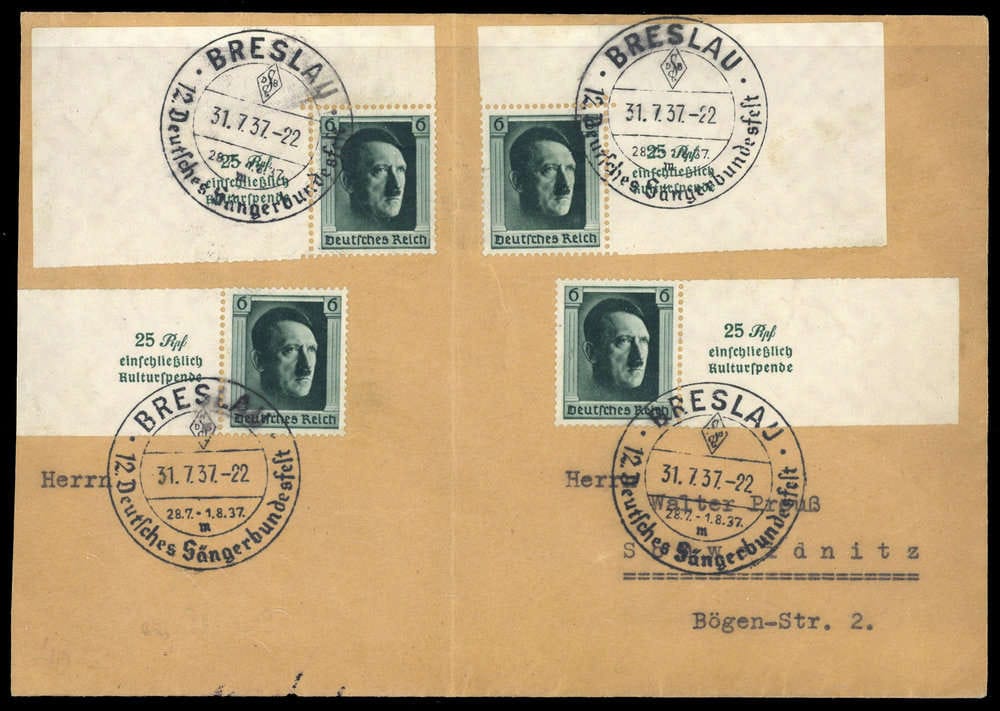 1937, 6+19 Pfg. cultural promotion, 4 block single stamps (2x corner margin and 2x margin piece) together as multiple franking on cover with SST "BRESLAU 31.3.1937 - 12. Deutsches Sängerbundesfest", addressed to Weidnitz, envelope vertical center bend