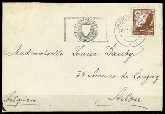 1934, 25 Pf golden eagle, M postmark "SAABRÜCKEN 23.3.38/UNFALLSCHUTZ ...", cover shortened on the left, traces of age due to transport, to ArbonLos