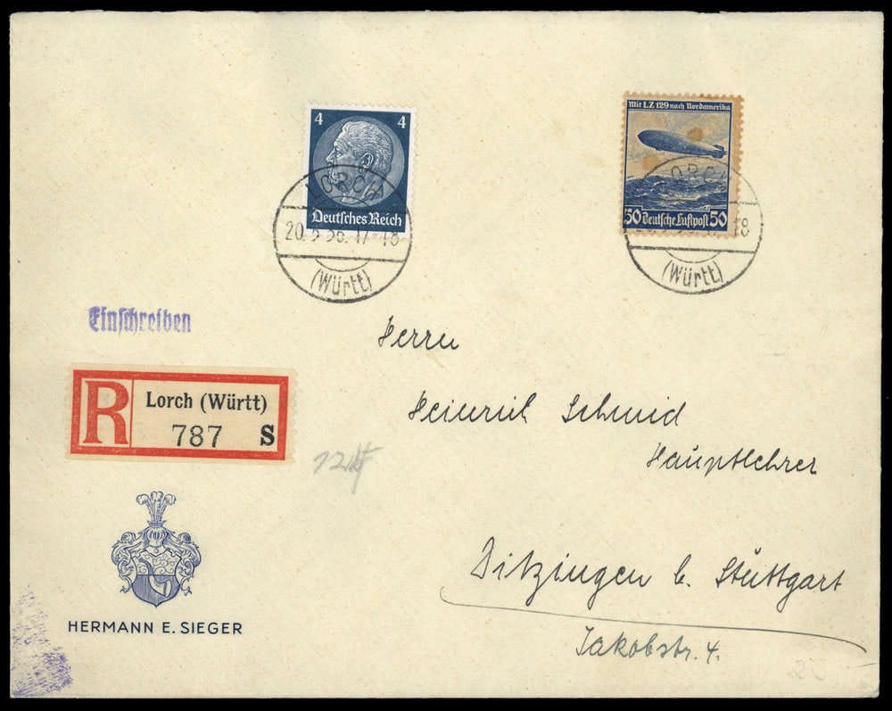 1936, 50 Pfg. airship Hindenburg with no. 514 together on R-cover from LORCH 20.5.1936, addressed to Ditzingen, rs. Arrival cancel, envelope a bit unclean at lower left.