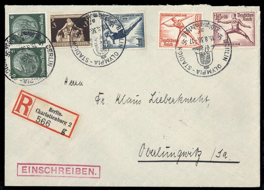 1936, 15+10 Pfg. Summer Olympics and no. 610, 612, 617 + 516 (2x) together on R-cover with SST "BERLIN 15.8.1936 - OLYMPIA-STADION", addressed to Oberlungwitz, rs. Arrival cancel, light opening marks on top.