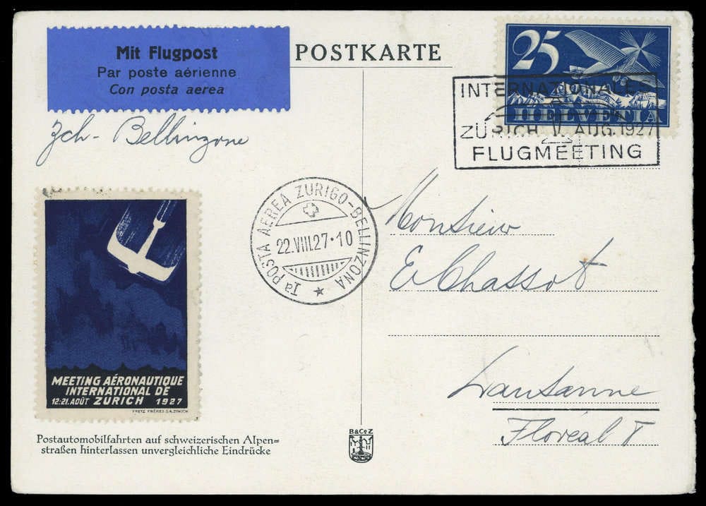 1927, 25 C. Air mail on postcard with postmark "INTERNATIONALES FLUGMEETING ZÜRICH AUG. 1927", addressed to Lausanne, also postmark "1st POSTA AEREA ZURIGO - BELLINZONA 22.8.1927" and matching blue/black vignette, light traces.
