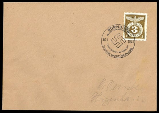 "NÜRNBERG 30.1.1943 10 ANNIVERSAIRE DE MACHTÜBERNAHME", SST sur phil. Lettre avec 3 Pfg. SST$