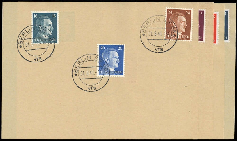 1941, 1-24 Pfg. Hitler sur quatre feuilles de présentation avec "Berlin SW 68 1.8.41" (ME 157,-)