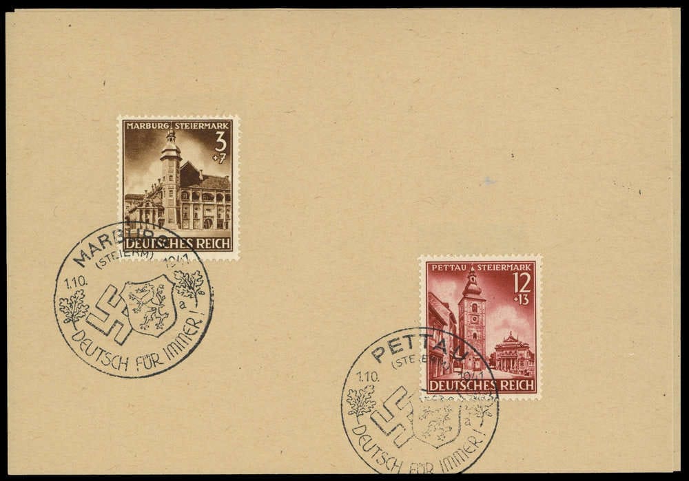 1941, Incorporation sur deux feuilles de présentation avec les quatre SST Marburg, Pettau, Velden et Meistern