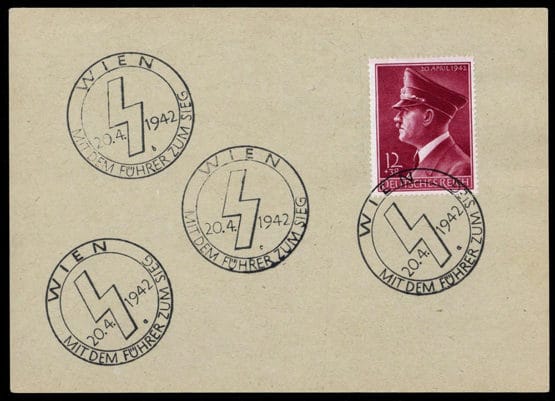 1942, Anniversaire sur carte vierge avec quatre SST "Wien 20.4.42 Mit dem Führer zum Sieg", avec lettres "a, b et c"