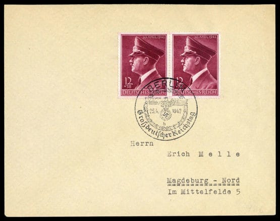 1942, 12+38 Pfg. Hitler, paire horizontale sur lettre avec SST "BERLIN 25.4.1942 - GROSSDEUTSCHER REICHSTAG", adressée à Magdeburg.