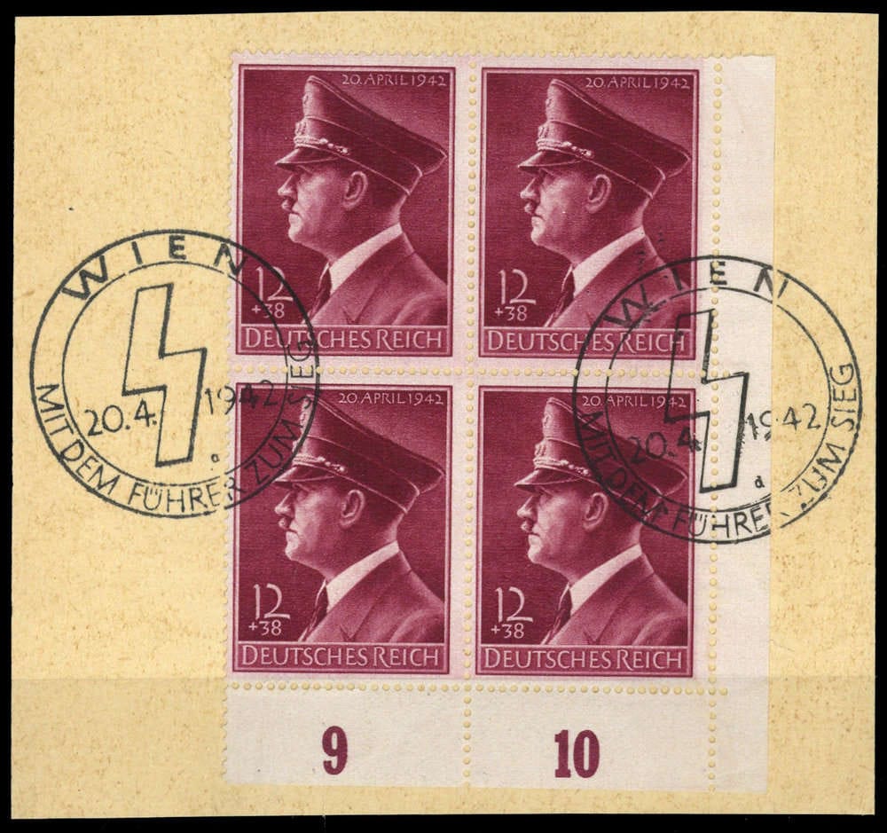1942, 12 Pfg. anniversaire, bloc de quatre timbré du coin de l'arc r.u. avec SST "Wien 20.4.42 Mit dem Führer zum Sieg" sur section (ME 112,-+)