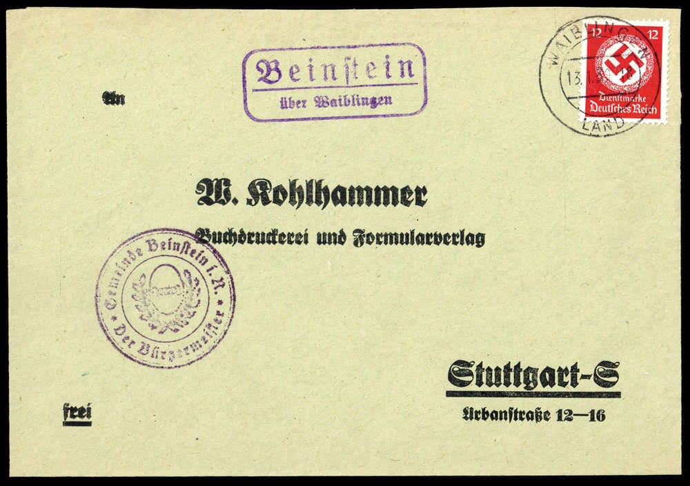 "BEINSTEIN ÜBER WAIBLINGEN", Ra2 violet sur lettre avec 12 Pfg. service de "Waiblingen Land 13.1.39" à Stuttgart