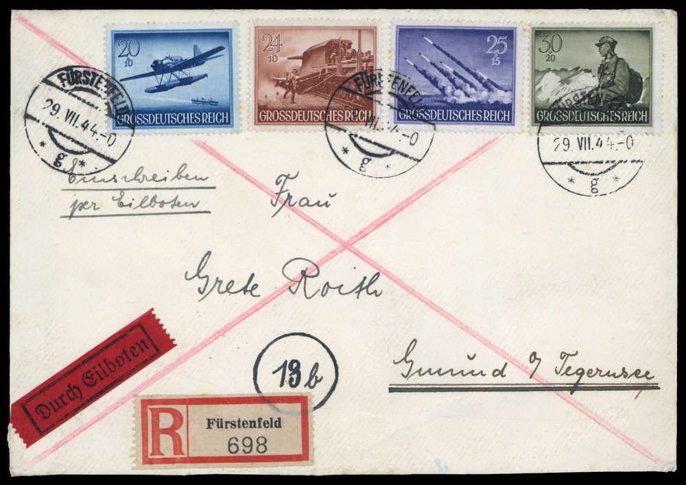 1944, 20-30 Pfg. journée de la Wehrmacht, 4 valeurs ensemble sur lettre R-Eilboten de FÜRSTENFELD 29.7.1944, adressée à Gmund/Tegernsee, rs. Cachet d'arrivée, légères traces de collage.