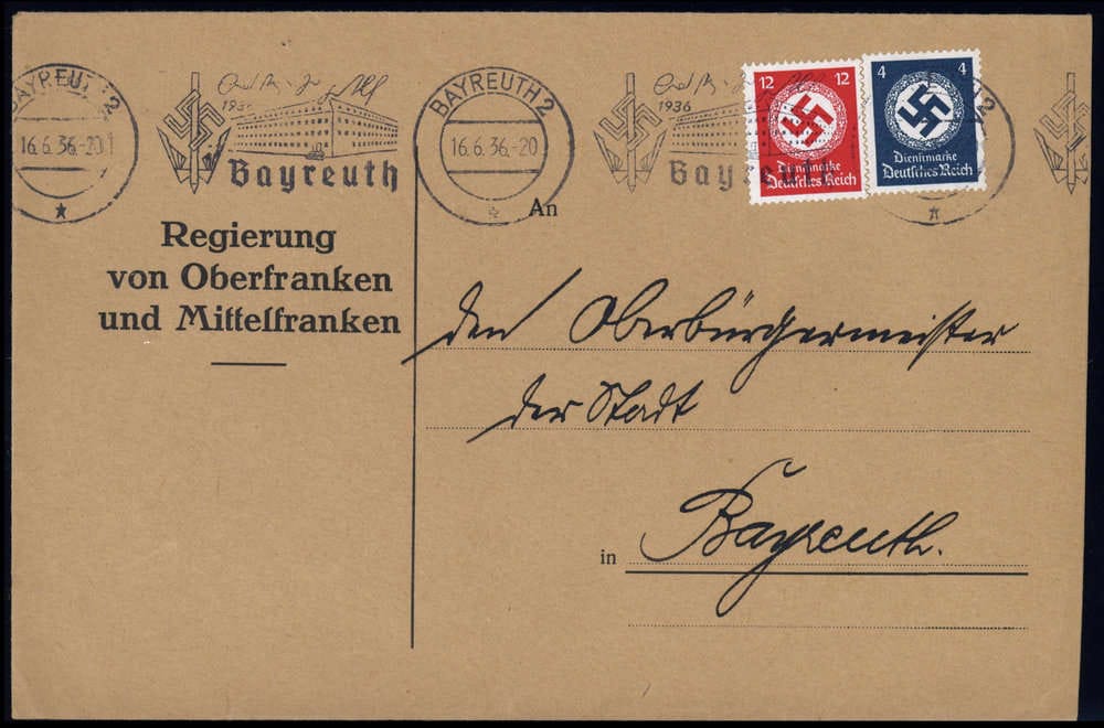 1934, 4+12 Pfg. timbre-poste sur lettre (gouvernement de Haute-Franconie et de Moyenne-Franconie / plus grand format) avec cachet de publicité par roulette "BAYREUTH 2 - 16.6.1936" à Bayreuth.