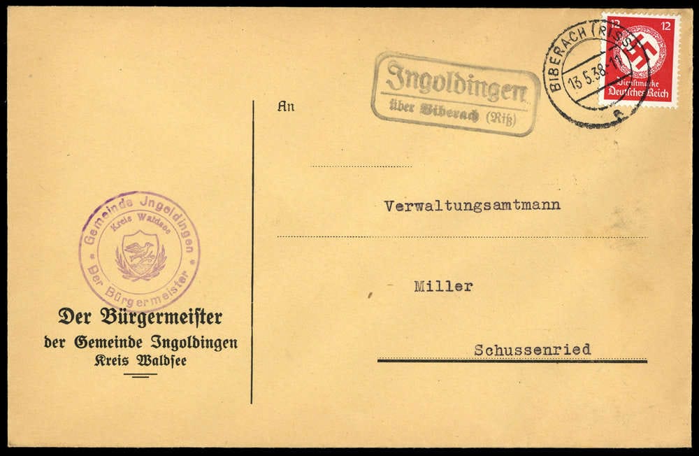 1934, 12 Pfg. timbre-poste sur lettre "Der Bürgermeister der Gemeinde Ingoldingen / Kreis Waldsee" de BIBERACH 13.5.1938 à Schussenried, Ra2 Posthilfstellenstpl. noir "Ingoldingen über Biberach (Riß)".