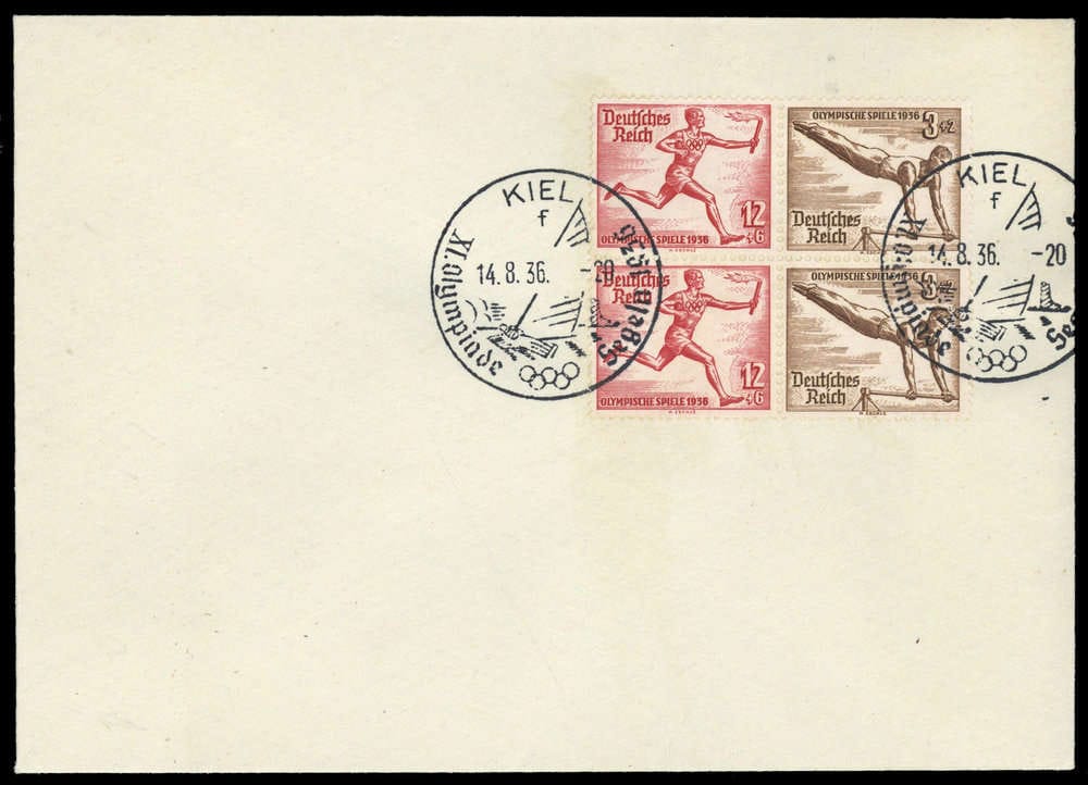 1936, 12+3 Pfg. Olympische Spiele, deux fois ensemble sur lettre vierge y compris SST correspondant "KIEL SEGELN 14.8.1936 - XI. OLYMPIADE", légères traces de cachet.