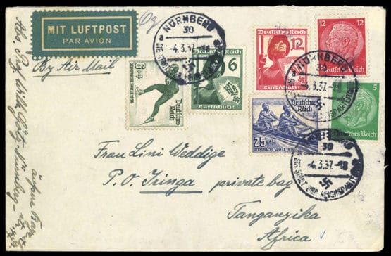 1936, 25+15 Pfg. Jeux Olympiques avec les n° 515, 519, 600, 644 +645 ensemble sur lettre de la poste aérienne de NÜRNBERG 4.3.1937, adressée à Tanganyika / Afrique, dos. Cachet d'arrivée, traces de vieillissement et d'oblitération.