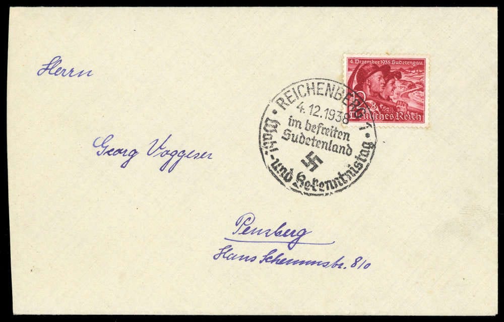 1938, 12+8 Pfg. Sudetenland sur lettre avec SST "REICHENBERG 4.12.1948 - SUDETENLAND", enveloppe raccourcie à gauche et marque traces de collage.