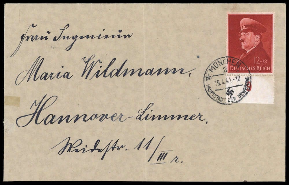 1941, 12+38 Pf anniversaire, pièce sous marge, K1 "MÜNCHEN 2 19.4.41", rs. Vignette (Wehrschatz), bogue descr., lettre traces de grattage et de pliage, vers Hanovre