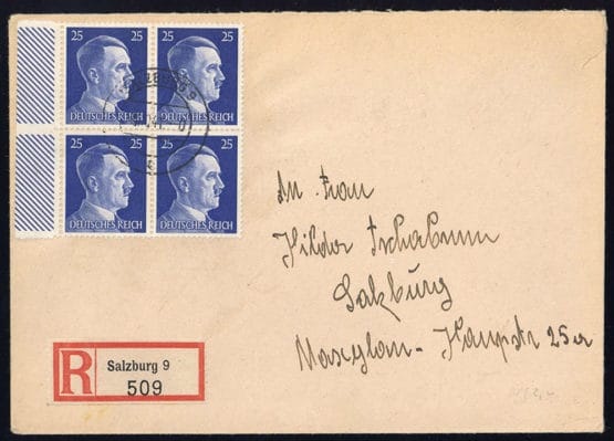 1941, 25 Pfg. Hitler, bloc de quatre bords gauche comme MeF sur lettre R de SALZBURG 29.10.1941, adressée à Salzburg, rs. Cachet d'arrivée, petite erreur de marge en haut à droite.