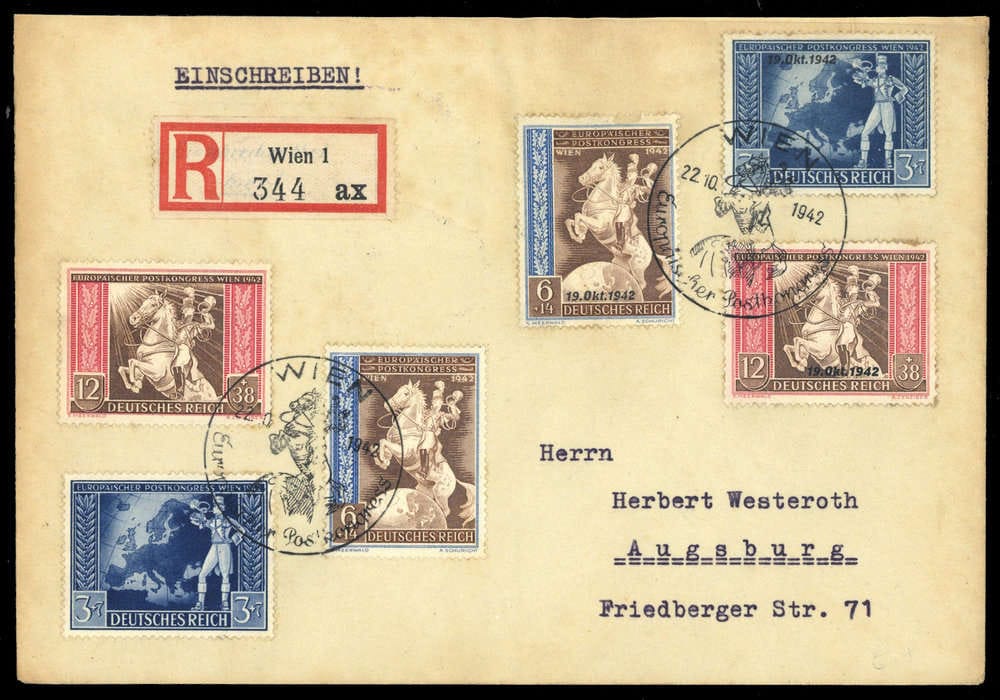 1942, Postkongress + Post- und Fernmeldeverein, chaque ensemble sur lettre R avec SST correspondant "WIEN 22.10.1942", adressée à Augsburg, rs. Cachet d'arrivée de la poste. Traces de collage et de vieillissement, donc un peu défraîchi.