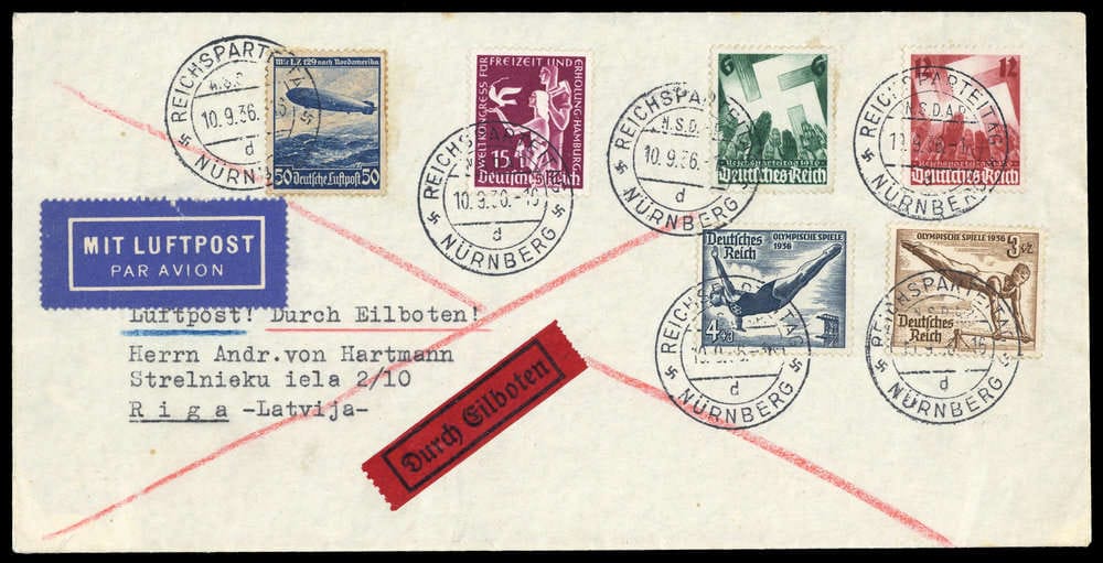 1936, 6+12 Pfg. Reichsparteitag avec n° 606, 609, 610 + 623 ensemble sur lettre aérienne en courrier express avec SST "NÜRNBERG 10.9.1936 REICHSPARTEITAG NSDAP", adressée à Riga, pas d'indication de cachet au verso, traces de collage sur les timbres, néanmoins décoratif.