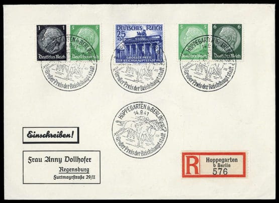 1941, 25 Pfg. Grand Prix avec 1+5 et 5+6 Pfg. Hindenburg sur phil. Lettre R avec SST "Hoppegarten 14.9.41 Großer Preis" à Regensburg
