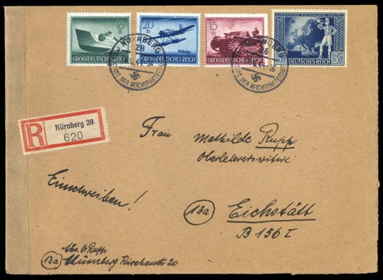 1944, 15-20 Pfg. Wehrmacht et Nr. 820 ensemble sur lettre R de NÜRNBERG 26.6.1944, adressée à Eichstätt, rs. Cachet d'arrivée, enveloppe avec des défauts d'ouverture en bas, format un peu plus grand.