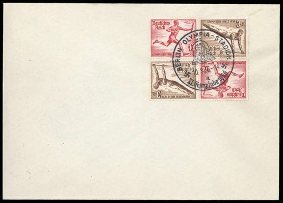 1936, 3+12 Pfg. Jeux Olympiques, deux fois ensemble sur lettre vierge avec SST correspondant "BERLIN OLYMPIA-STADION 10.8.1936 - XI. OLYMPIADE".