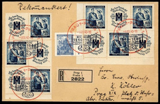 1940, 6 x 60 H. Croix Rouge avec espace vide en deux unités et 80 H. Pernstein sur lettre R locale avec SST "Prague 4.XII.40 Briemarke 1840-1940"