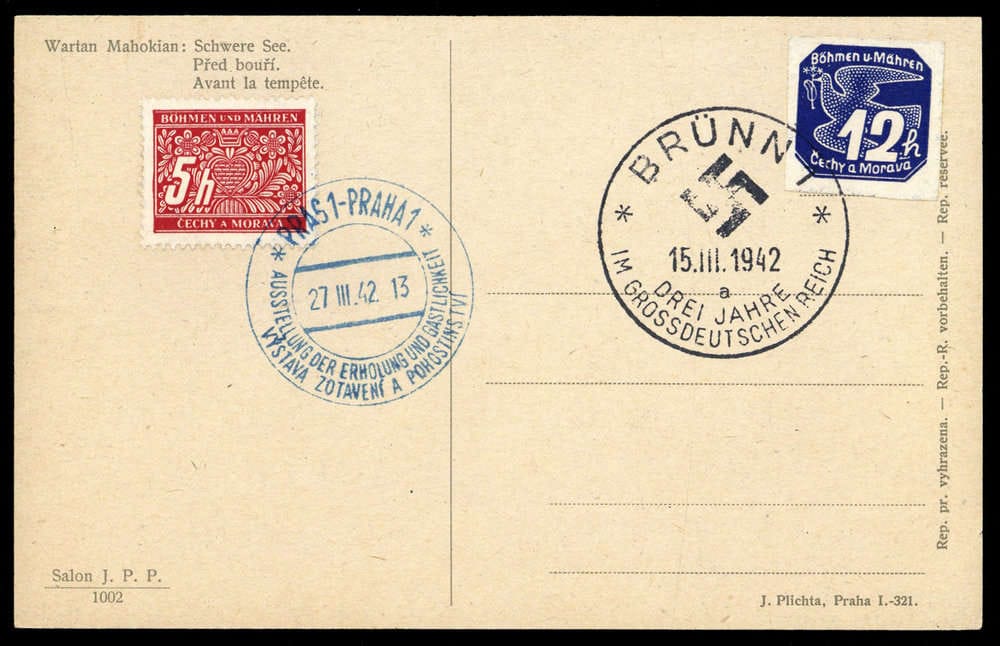 "BRÜNN 15.III.1942 TROIS ANS DANS LE GROSSDEUTSCHEN REICH" et bleu "PRAGUE 27.III.42 AUSSTELLUNG DER ERHOLUNG", les deux SST ensemble sur AK "Mahokian : Schwere See" avec deux valeurs