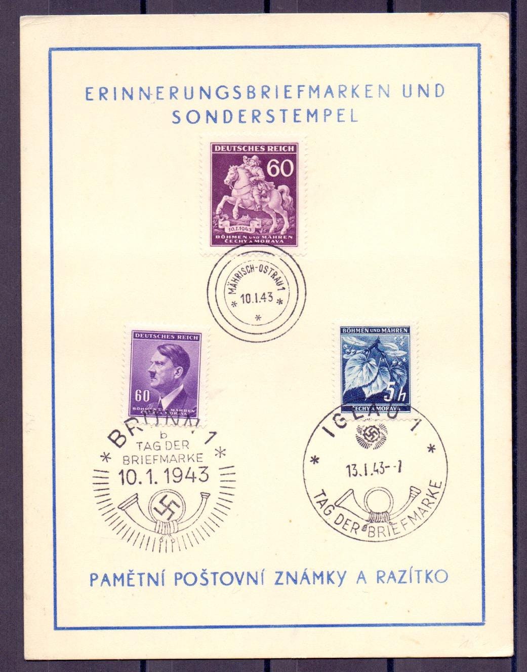 1943, 60 H. Tag der Briefmarke avec EST "MÄHRISCH-OSTRAU 10.I.43", ainsi que 60 H. Hitler avec SST "BRÜNN TAG DER BRIEFMARKE 10.1.1943" et 5 H. Lindenzweig avec SST "IGLAU TAG DER BRIEFMARKE 13.I.43" sur carte commémorative sans adresse