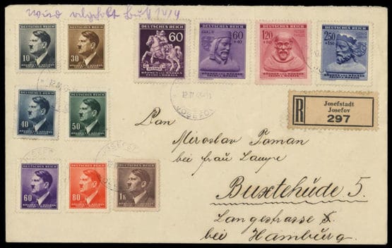1943, Winterhilfswerk, 3 valeurs avec le n° 113 et 7 différentes valeurs Hitler ensemble sur lettre R de JOSEFSTADT 12.4.1943 à Buxtehude, dos. Timbre d'arrivée, timbres et lettre légèrement marqués.