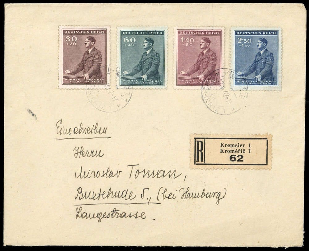 1942, Adolf Hitler, 4 valeurs complètes sur lettre en R (traces d'autocollant) de KREMSIER 12.5.1942 à Buxtehude, rs. Légères traces de transport.