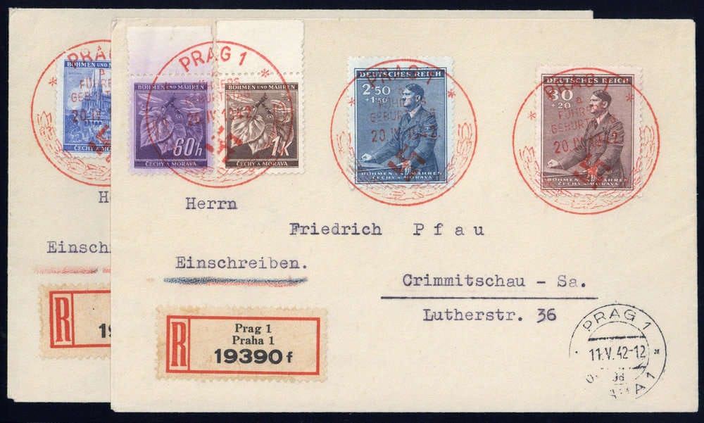 1942, 30 H et 2.50 K resp. 60 H et 1.20 K anniversaire Hitler, chacun avec supplément sur 2 R-FDC avec ESST rouge "PRAG 20.IV.1942", K2 de départ "PRAG 11.V.42", rs. K2 Ak "CRIMMITSCHAU 12.V.42"