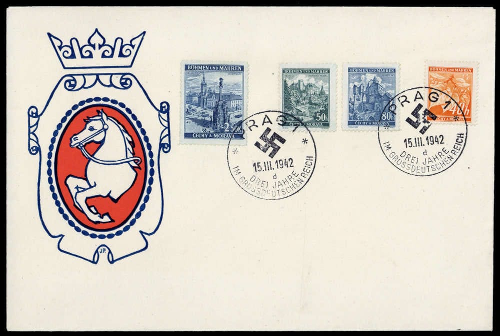 "PRAGUE 15.III.1942 TROIS ANS DANS L'EGLISE GROSSEUTIQUE", 2 x sur enveloppe-bijou avec quatre valeurs